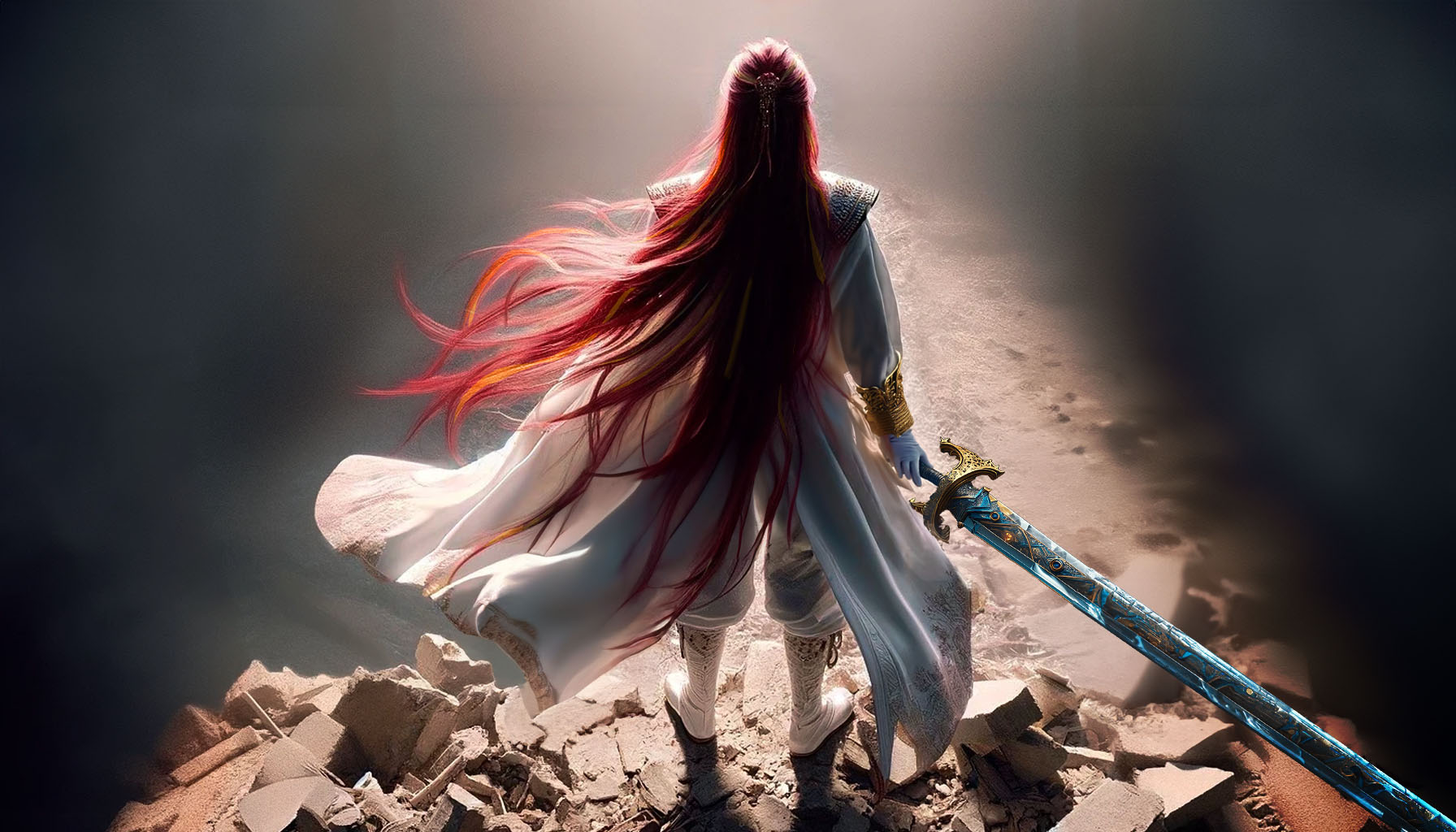 白を基調とした豪奢で華麗な衣装。それを覆う長髪は……燃え上がるような、炎の色。
