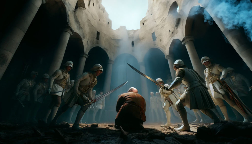 帝国兵たちが彼女のものらしき名を呼び、助けに駆け寄ろうとするが、タイタスの親衛隊も負けていない。しばらく帝国軍の強さに圧倒されて手が出せずにいたマリプレーシュの兵たちも応戦し始め、騎士の配下たちを彼女のもとへ近づけまいとした。