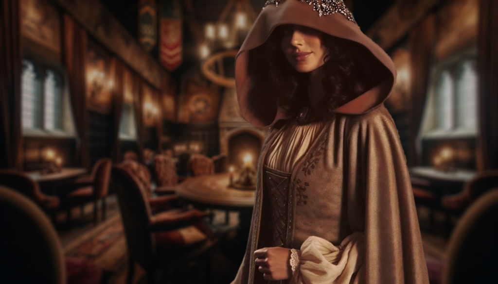 女性は三人の向かい側に、護衛たちは外側を囲むように席についた。彼女が頭巾を取ると、深い栗色の長い巻き髪と、淡い小麦に染まった艶やかな肌が印象的な美貌が露わになった。
