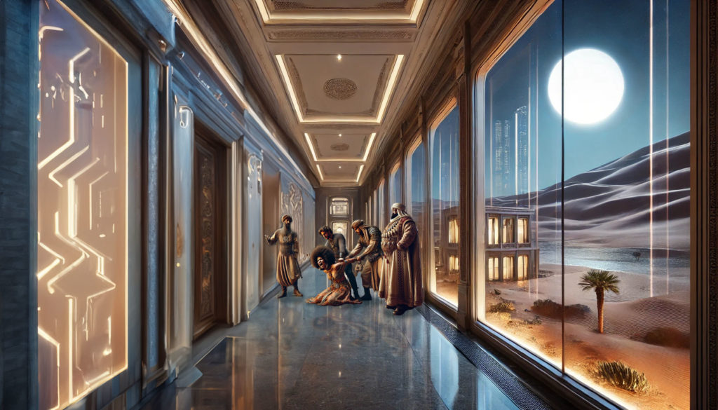 その提案にアルベールも同意し、ふたりは共に部屋を後にした。回廊の外側には満月の優美な姿を映し出す美しいオアシスが広がっているが、砂が吹き込まないように全面に硝子の窓が張られている。高度な技術と建築美との見事な調和に、彼らは見ていて飽きぬと言って感心しながらゆっくり歩みを進めていた。