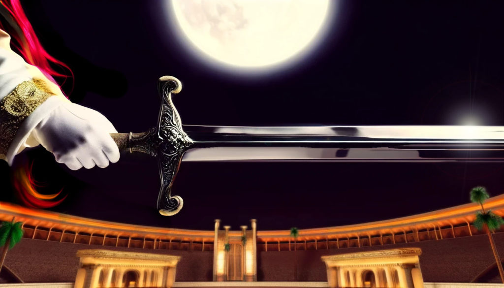 兵士は返答の機会も与えず、レオナールの腕を引っ張り、その部屋から屋外へ続く石造りの階段通路へ押し込んだ。……仕方なく十数段を上ると、視界が急に開け、タイル張りの広場のような場所……どうやら闘技場らしきところへ出る。満月の光に照らされた前方を見て、レオナールは息を呑んだ。