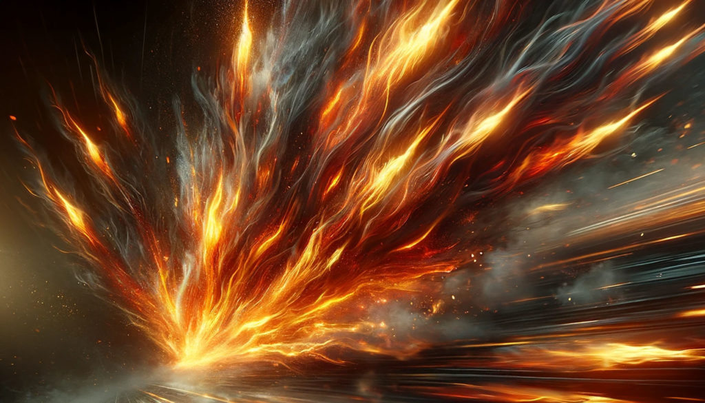命乞いをしようと、すぐ目前まで迫る相手の姿を捉えようとする。……今まさに自分めがけて振り下ろされようとしているものは、月光に照り映える刃ではなく……激しく熾る、火焔の塊。