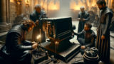 レオナールが彼らの前まで歩み寄ってきて怪訝な表情でそれを見ると、四人は持ち場に戻り、隊長らしき者が咳払いをする。